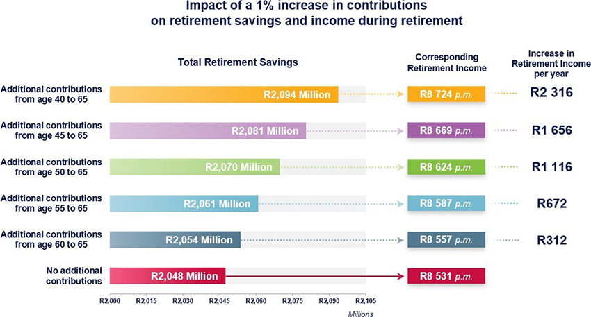 For example, consider a 40-year-old individual who contributes 16.5% of their salary towards their retirement savings. They have done so from age 20, and will continue to do so until retirement at age 65. This would result in expected future retirement savings of R2,19 million, which would allow them to purchase a retirement income of R 9 130 per month.