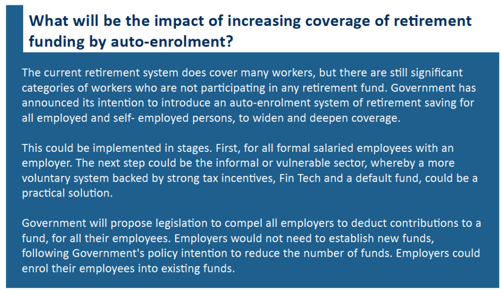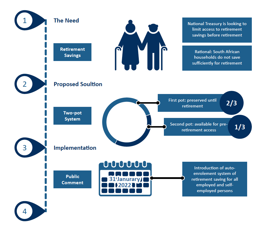National Treasury has published a paper, ‘Encouraging South African households to save more for retirement’, for public comment following the November 2021 announcement by the Minister of Finance of a proposal to boost household savings. The proposal seeks to increase preservation before retirement and increase flexibility through partial access to retirement funds through a “two-pot” system.