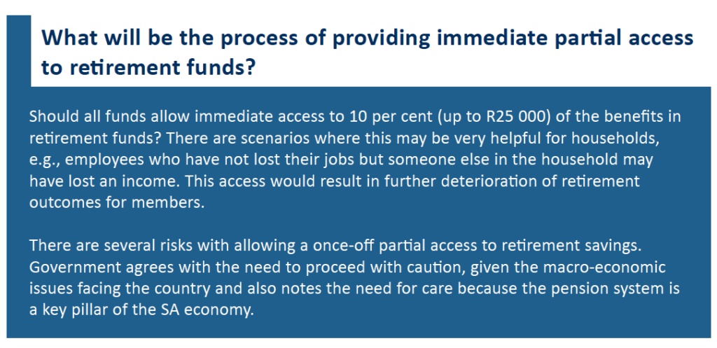 By vesting members’ rights in respect of their accumulated savings, this should reduce the need for any employees to resign before the amendments become effective, because they would still be able to withdraw their retirement interest that was available at the implementation date. There would be no vested rights for individuals joining a retirement fund after the implementation date.